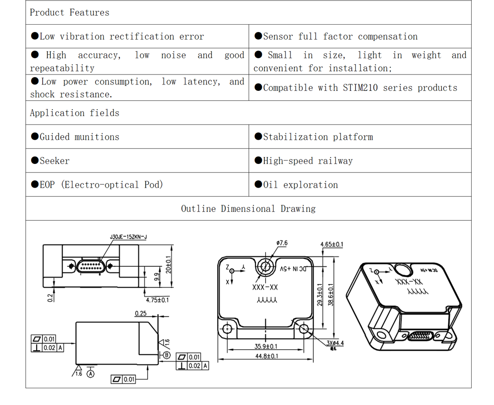 Three-axis MEMS Gyroassembly is composed of MEMS gyro chip, temperature sensor, digital signal processing circuit, structure, and software, etc. It is used to measure the three-axis angular rates of the carrier in real-time. Can replace Sensono STIM210.