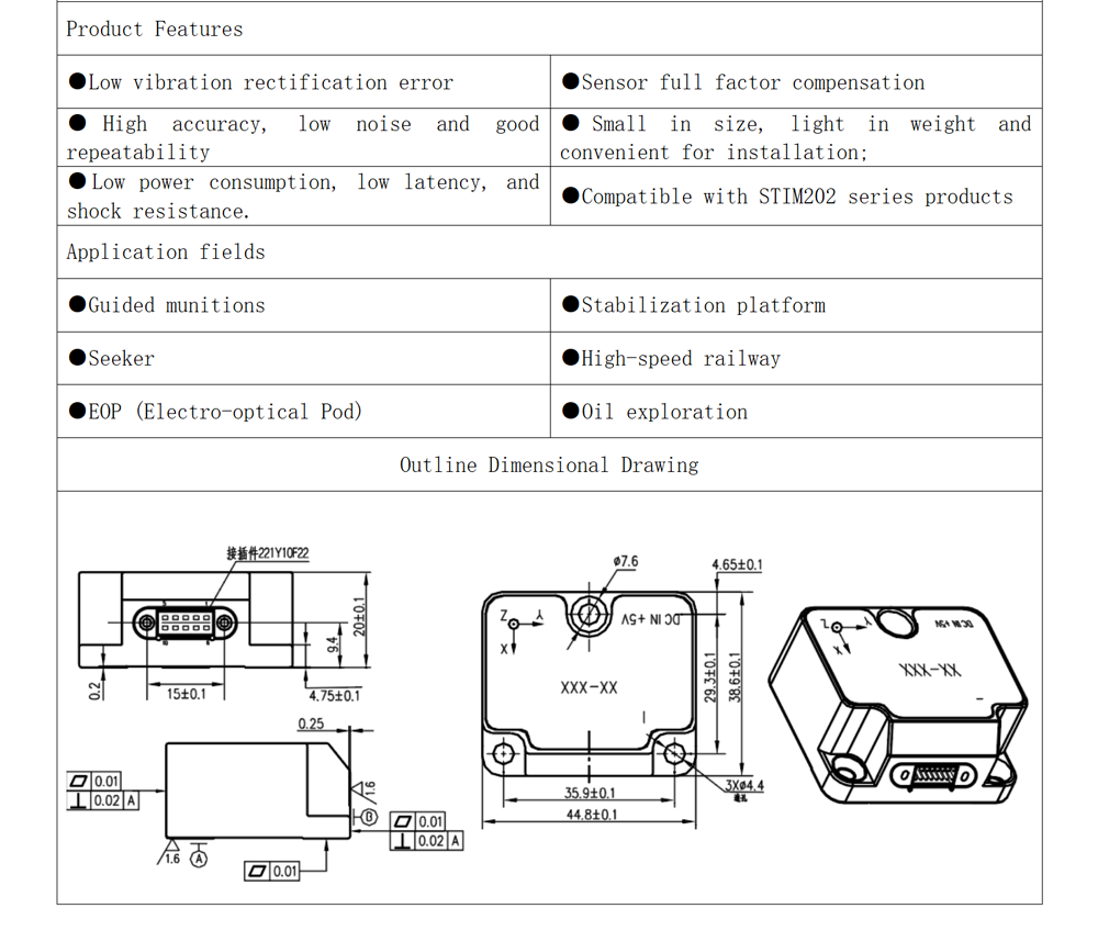 Three-axis MEMS Gyroassembly is composed of MEMS gyro chip, temperature sensor, digital signal processing circuit, structure, and software, etc. It is used to measure the three-axis angular rates of the carrier in real-time. Can replace SensonoSTIM202.